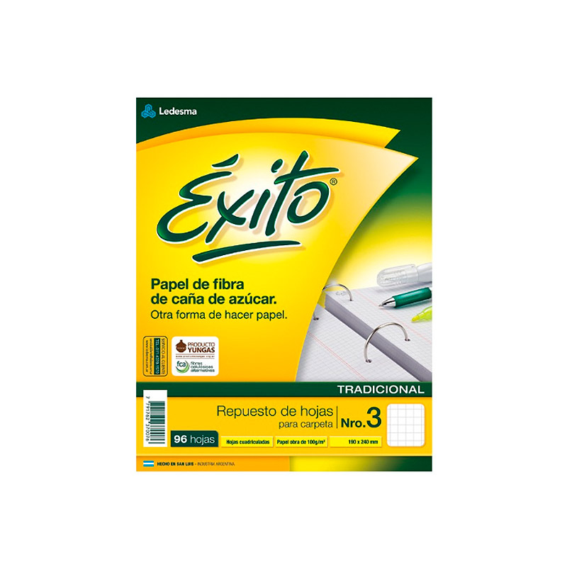 Repuesto escolar Éxito 96 hojas Cuadriculadas. Tamaño carta. Papel extra blanco