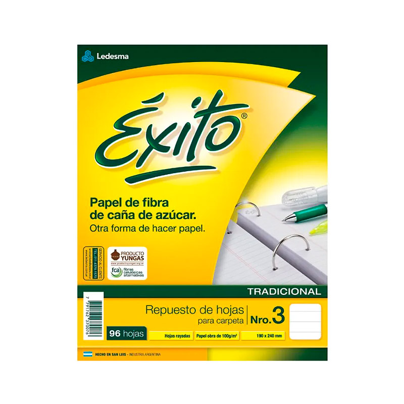 Repuesto escolar Éxito 96 hojas Rayadas. Tamaño carta. Papel extra blanco