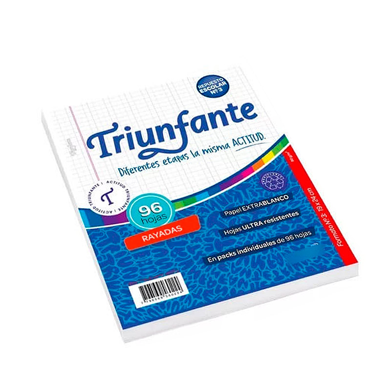 Repuesto escolar Triunfante 96 hojas Rayadas. Tamaño carta. Papel extra blanco